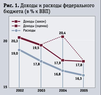 Изменение бюджетного законодательства в части изменения нормативов распределения доходов между уровнями бюджетной системы принесет федеральному бюджету дополнительно 0,6% ВВП. Однако прочие факторы предопределяют снижение доходов также на 0,6% ВВП. Итого, в 2005 г. произойдет снижение доходов федерального бюджета на 2,6% ВВП.