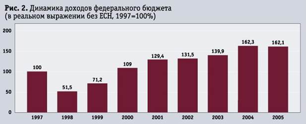 Минфин РФ часто упрекают, что перераспределение доходов, отмена оборотных налогов, налога с продаж и мелких региональных налогов приводит к снижению доходов бюджетов субъектов РФ. Однако, по статистике, темпы роста доходов территориальных бюджетов с 1999 г. консолидировано нарастают. В 2004 г. по отношению к 1999 г. прирост доходов составил 334%. Даже с учетом нормативов отчисления в федеральный бюджет доходы субъектов все равно остаются достаточно высокими. Темпы прироста доходов регионов-доноров выше, чем регионов-реципиентов, поскольку в донорских регионах сконцентрирована промышленная база, на состоянии которой, прежде всего, отражается экономический рост.