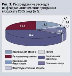 На рис. 3. показано распределение в 2005 г. расходов бюджета на федеральные целевые программы. Большая часть средств идет на субсидирование национальной экономики (41,2%) и региональное развитие (25%).