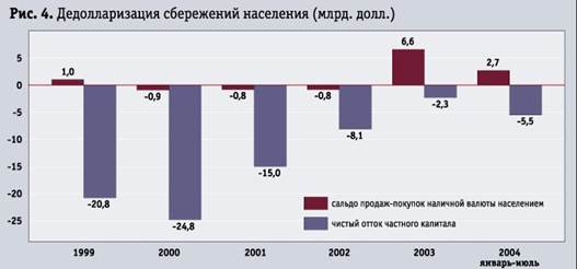 На рис. 4 показана дедолларизация сбережений населения. Сальдо операций по покупке-продаже иностранной валюты населением в 2003 г. составляет 6,6 млрд. долл., т. е. на 6,6 млрд. долл. население больше купило рублей, чем продало валюты. Связывание рублей также влияло и на снижение инфляции, на повышение доверия к рублю. В первом полугодии 2004 г. эта тенденция замедлилась в связи с тем, что рубль укреплялся меньшими темпами из-за меньшего доверия к банкам. В результате принятых мер в отношении банков, которые не выполняют нормативные требования, во втором квартале 2004 г. население фактически вышло на нулевое сальдо по продажам и покупкам иностранной валюты.