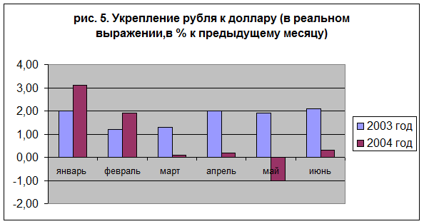 Если в результате количество инструментов связывания сократилось, необходимо снова больше базироваться на бюджетных механизмах, среди которых нужно отметить укрепление рубля к доллару. На рис. 5 видно, что в мае 2004 г. произошло ослабление рубля в реальном выражении, но уже в июне 2004 г. рубль незначительно укрепился. Это изменение тенденции по укреплению рубля тоже сегодня стало влиять на приток спекулятивного капитала на российский рынок и, соответственно, на переход на рубли. В этой связи при сохраняющемся некотором оттоке капитала приток капитала сократился. В целом наблюдается увеличение отрицательного сальдо оттока капитала.