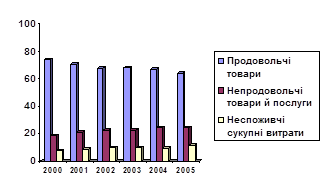 Зростання ресурсів сільських домогосподарств сприяє якісним змінам у структурі витрат сільського населення. Зокрема, практично стабільно скорочується частка витрат на продовольчі товари, дедалі більше сукупних витрат спрямовується на неспоживчі напрямки: допомога, купівля цінних паперів, вклади до банків, будівництво та капітальний ремонт житла тощо. За часткою неспоживчих витрат сільські домогосподарства значно випереджають міські, де ця частка у 2004 році становила 6,6 %, а за 9 місяців 2005 року – 8,4 % (рис. 8).