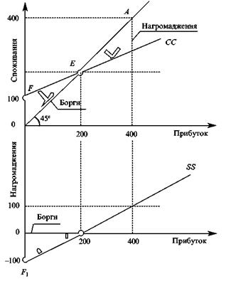 Графіки споживання СС і нагромадження SS відображають взаємозв'язок між прибутком і споживанням, а також прибутком і нагромадженням. Функція споживання показує, що споживання зростає із зростанням прибутків, причому частина прибутків йде на нагромадження, через що споживання зростає повільніше за прибуток, тобто графік відхиляється від бісектриси, що відповідає рівномірному зростанню. Якби графік споживання співпадав з бісектрисою ОА, це означало б, що всі прибутки споживаються. Ну відрізку графіку споживання від точки початку координат до точки Е величина споживання перевищує величину прибутків, процес споживання відбувається за рахунок майбутніх прибутків, тобто в борг. Для побудови графіка нагромадження потрібно мати дані про обсяги споживання і боргів на певний період, що аналізується.