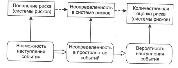 Переход от возможности наступления события, возникновение которой сопровождается появлением риска, к вероятности наступления события происходит через преодоление неопределенности в пространстве событий или ее уменьшение. В свою очередь это вызывает снижение неопределенности в системе рисков до уровня, позволяющего дать количественную оценку риска.
