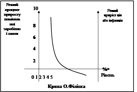 Принципово нові підходи до даної проблеми були представлені у відомій роботі англійського економіста Олбані Філіпса (1914-1975) “The Relations Between Unemployment and the Rate of Change of Money Wage in the U.K., 1861- 1957”, яка вийшла в 1958 році. Узагальнюючи статистичні дані по Великобританії за 1861-1957 роки, автор вибудував криву, яка характеризує взаємозв’язок між середньорічним зростанням заробітної плати і безробіттям . Цей взаємозв’язок виявився зворотнім: якщо заробітна плати швидко зростала, безробіття було невеликим і навпаки. Крива О.Філіпса виявилась ввігнутою відносно осі ординат : одному і тому ж приросту заробітної плати відповідало порівняно невелике скорочення безробіття при низькому його рівні і значне – при високому: