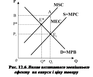 виробляє за кривою пропонування, яка відповідає його граничним приватним витратам (рис. 12.6). Оскільки він не сплачує за шкоду, яку завдає третім особам, і не несе витрат, пов’язаних з усуненням негативного ефекту, його крива розташована нижче кривої граничних суспільних витрат , які включають витрати на очищення забрудненого середовища, або граничні екстернальні витрати : . Приватний виробник обирає оптимальний обсяг випуску за правилом , тому виробляє обсяг більший, ніж суспільно оптимальний, за нижчою рівноважною ринковою ціною