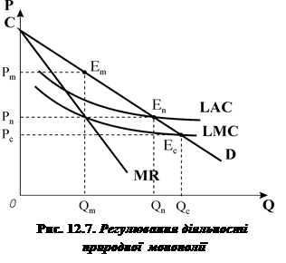 , що виникають у галузях, де зростання обсягів виробництва супроводжується значною економією на масштабах. Внаслідок значного зростаючого ефекту масштабу криві і є спадними і не перетинаються в межах аналізованих обсягів випуску. Якби природна монополія діяла як проста монополія, то вона б максимізувала прибуток за правилом , випускаючи обсяг за ціною з рівновагою в точці (рис. 12.7).