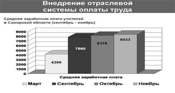 За первый месяц работы в новых условиях средняя зарплата учителей в регионе возросла на 38% и составила 7860 рублей, превысив мартовский уровень (4200 рублей) на 87%. В октябре она достигла 8178 рублей, а в ноябре – 8433 рублей. За три месяца нового учебного года средняя зарплата учителя в Самарской области по сравнению с мартом увеличилась в 2 раза!