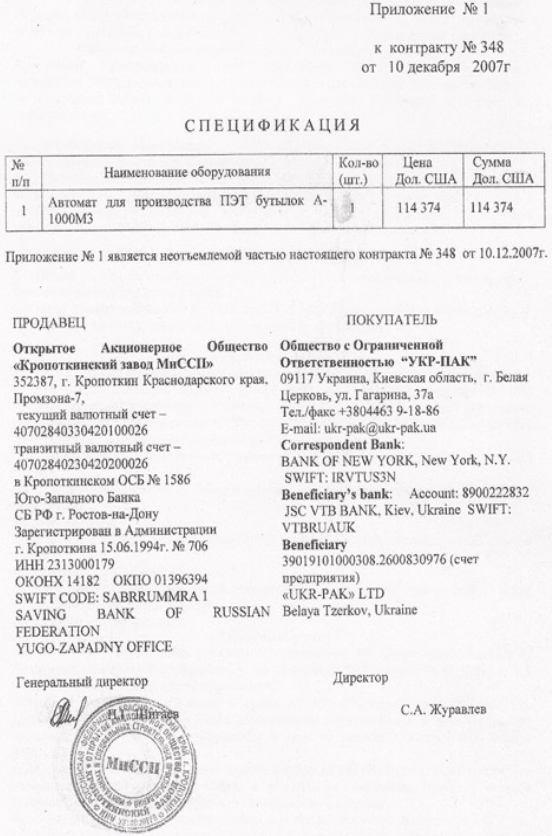 Імпортний контракт 2007 року на поставку обладнання з Росії