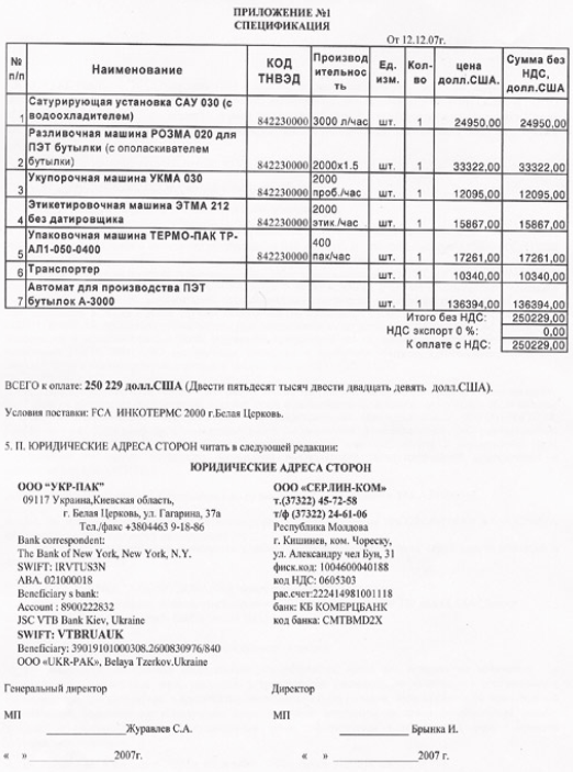 Додаток до експортного контракту ТОВ "УКР-ПАК" 2007 року на поставку комплексної лінії обладнання в Молдову