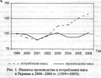 Вступление Украины в ВТО и ее интеграция в мировую экономику выдвигают высокие требования к эффективности производства и конкурентоспособности продукции отечественных предприятий. Эта проблема актуальна и для отраслей, занимающихся переработкой сельхозпродукции. Значительный потенциал развития, в частности в сфере животноводства, пока не реализуется в полной мере. Так, динамика производства мяса в Украине после 2000 г. колебалась в пределах 1,4-1,7 млн. т в год. Вместе с тем общие объемы потребления мяса заметно выросли (см. рис. 1), что было обусловлено ростом доходов населения; однако внутренний спрос остается относительно низким: в 2006 г. потребление мяса на душу населения составило лишь 60% от уровня 1990 г. (около 80% от среднего мирового показателя, на 87 и 83% ниже, чем, соответственно, в Польше и России).