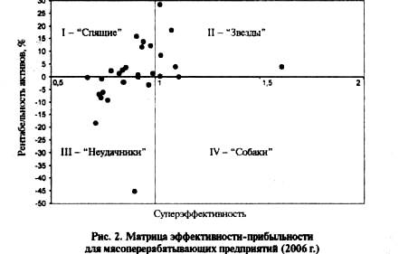Для 2-критериапьной оценки эффективности предприятий выборки мы построили матрицу эффективности-прибыльности, в которой сопоставлены суперэффективность и рентабельность активов (рис. 2).