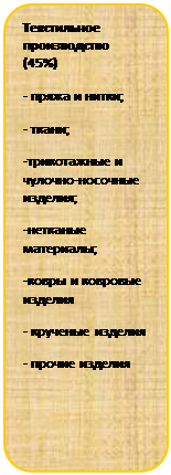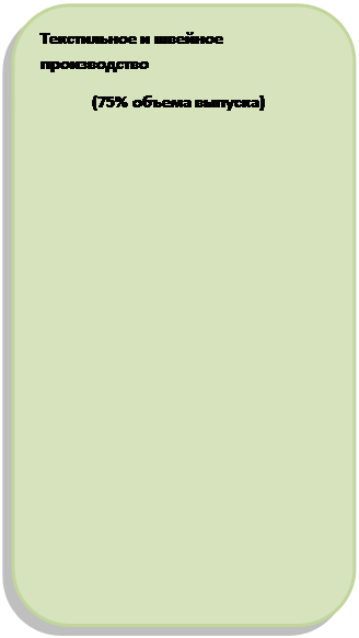 Доминирующее положение в товарной структуре проданных товаров занимает продукция текстильных отраслей (хлопчатобумажной, шерстяной, льняной, шелковой, трикотажной, нетканых материалов и др.), доля которой в объеме отгруженной продукции составила 53,7%, а доля продукции швейной, кожевенно-меховой, обувной и других отраслей - 46,3 процента.