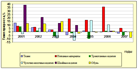 После кризиса 1998 года в течение двух лет отрасль демонстрировала рост производства за счет эффекта импортозамещения и девальвации рубля, но в последующие годы в силу объективных и субъективных причин она не смогла закрепить позитивные тенденции. Так, темп роста производства всех видов тканей к уровню предыдущего года составил в 2000 году 20,9%, в 2001 году - 12,7%, в 2003 году он снизился до 3%, а в 2004 году темп роста имел уже отрицательное значение – 95,6 процентов.