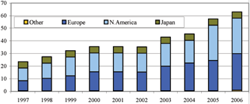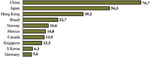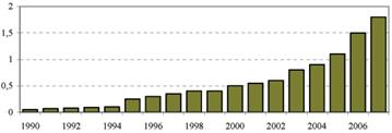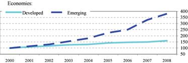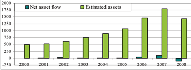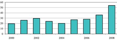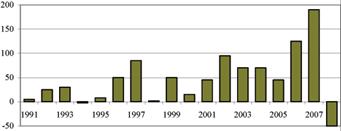 Рис.9. Динамика покупок облигаций США развивающимися странами в 2000–2008 гг. (млрд долл., данные министерства финансов США)