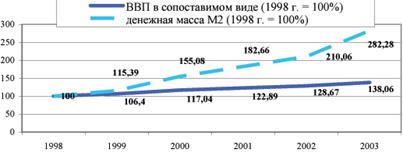 В 2004–2007 гг. денежная масса (наличные деньги с учетом остатков в кассах и на счетах кредитных организаций, на счетах обязательных резервов, по привлеченным этими организациями средствам в национальной валюте, депонированные в Банке России) выросла более, чем на 60%. Жесткое ограничение роста денежной массы в 90-х гг. привело к кризису инвестиций, бурному росту бартера и денежных суррогатов, теневого псевдофинансового рынка. Однако, слишком быстрый рост этой массы увеличивает инфляцию, которая лишь ненамного снизилась в 2003–2007 гг. и остается намного большей, чем в ЕС и ряде стран СНГ. Для воспроизводства оборотного капитала важен баланс между снижением инфляции и изменением курса рубля под воздействием динамики платежного и капитального баланса. Рост курса не только препятствует экспорту, но и стимулирует импорт конкурирующих товаров и услуг.