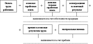 Хозяйственный расчет является методом, стимулирующим персонал в целом на соизмерение затрат на производство продукции с результатами хозяйственной деятельности (объем продаж, выручка), полное возмещение расходов на производство за счет полученных доходов, экономное расходование ресурсов и материальную заинтересованность сотрудников в результатах труда. Материальное стимулирование осуществляется путем установления уровня материального вознаграждения (заработная плата, премии), компенсаций и льгот. Заработная плата является частью валового внутреннего продукта, которая отражается в себестоимости продукции и распределяется в рыночной экономике между отдельными работниками исходя из количества и качества затраченного труда, а также спроса и предложений на товарную продукцию. В рыночных отношениях заработная плата выражает главный и непосредственный интерес наемных работников, работодателей и государства в целом. Нахождение взаимовыгодного механизма реализации и соблюдения интересов этого трехстороннего партнерства является одним из главных условий развития производства и составляет функцию управления трудом и заработной платой. Заработная плата представляет собой цену рабочей силы, соответствующую стоимости предметов потребления и услуг, которые обеспечивают воспроизводство рабочей силы, удовлетворяя материальные и духовные потребности работника и членов его семьи. Заработная плата является важнейшей составляющей стоимости продукции. Структура оплаты труда позволяет определить, какие составляющие входят в оплату труда работника, в каких статьях себестоимости и прибыли они отражаются, каков удельный вес конкретного элемента в общей величине, заработной платы (рисунок 2)