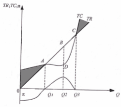Якщо маємо графічну форму - криві TR і ТС (рис.2.2 [9, с.152.]), тоді прибуток для будь-якого значення Q графічно визначається як різниця вертикальних координат цих кривих. У підсумку отримаємо криву прибутку π. При обсягах виробництва до Q1 фірма матиме збитки, при обсягах виробництва від Q1 до Q3 - прибуток. Максимальний прибуток досягається при Q2, а при обсягах виробництва понад Q3 фірма знову матиме збиток. Отже, обсяг виробництва, при якому досягається максимальний прибуток, визначається максимальною різницею між TR і ТС.