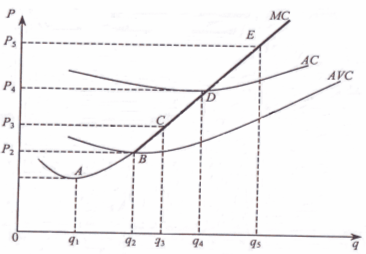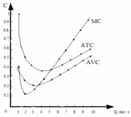 На рис.3.1 [7, с.342.] зображені криві граничних витрат (МС), середніх загальних (АС) і середніх змінних (АVС) витрат. При ціні P1, яка дорівнює мінімуму граничних витрат, досягається умова максимізації прибутку. Проте ціна не відшкодовує середніх змінних витрат (Р < АVС (q1)) і при будь-якому, обсязі виробництва (крім нульового) збитки будуть вищими за постійні витрати. Тому точка А на кривій МС не належить кривій пропозиції конкурентної фірми.