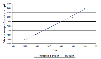 = 27,714 – показатель силы связи, т.е. за период 6 лет происходило увеличение товарооборота на 27,714 млн. руб. ежегодно. Изобразим исходный и выровненный ряды
