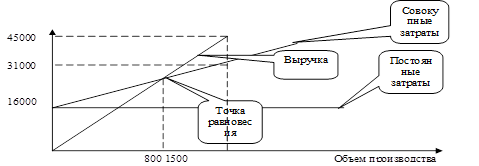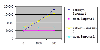 Из графика видно, что до объема производства, равного 1000 шт. выгодно приобретение станка 1, так как совокупные затраты меньше, а при объеме производства, превышающем 1000 шт., выгодно приобретение станка 2, так как теперь у него затраты меньше.