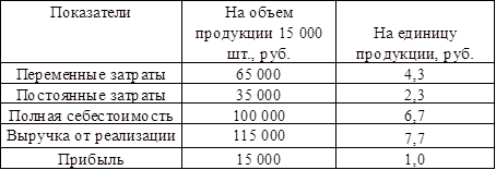 Предприятие продает на внутреннем рынке продукцию в объеме 15 000 шт. Данные о затратах на весь объем продукции приведены ниже в таблице. Предприятие имеет возможность дополнительно произвести некоторое количество такой же продукции и реализовать ее на внешнем рынке. Нужно установить цену на экспортируемую продукцию, применив метод ценообразования, когда постоянные расходы фактически возмещаются в ценах, установленных для определенного базового количества производимых изделий, а цены определяются на базе переменных затрат только дополнительного количества изделий, при сохранении прежнего уровня рентабельности.