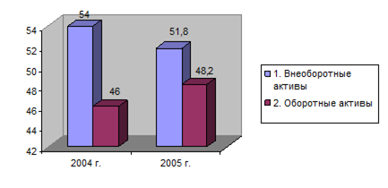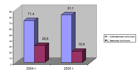 2.Анализ динамики и структуры имущества показывает, что в структуре имущества большую часть занимают внеоборотные активы, которые в 2004 г. составляли 54 %, а в 2004 г. – 51,8 %. Абсолютное изменение стоимости имущества свидетельствует о том, что снижение удельного веса внеоборотных активов вызвано тем, что стоимость оборотных активов увеличилась на 1855,2 тыс. руб., а внеоборотных активов - всего на 743,7 тыс. руб. В целом, деятельность предприятия и его имущественное положение значительно улучшилось. Финансирование большей частью осуществлялось за счет собственных средств.