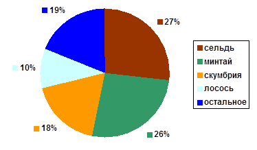 Среди наиболее продаваемых сортов рыбы - сельдь 27% от общего объема продаж рыбы, минтай - 26%, скумбрия - 18% ,лосось - 10% и 19% приходится на все остальные виды.
