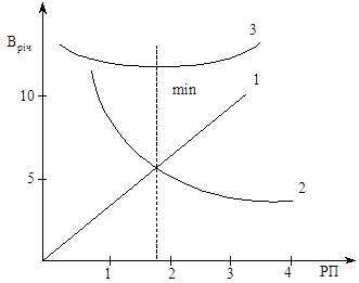 Величина запасів матеріалів істотно впливає на ефективність роботи підприємства і вплив цей неоднозначний. З одного боку, збільшення запасів унаслідок постачання великими партіями потребує більших оборотних коштів, додаткових витрат на зберігання матеріалів, компенсацію можливого псування та втрат. Ці втрати й витрати можна вважати пропорційними величині запасу, тобто партії поставки. З іншого боку, постачання великими партіями зменшує кількість поставок і, відповідно, транспортно-заготівельні витрати, бо останні відносно мало залежать від величини партії поставки, а в більшій мірі обумовлені кількістю цих партій (витрати на оформлення, пересилання документів, роз’їзди агентів, транспортування тощо). Зменшення величини партії поставок спричиняє зворотний ефект: втрати й витрати, зв’язані зі зберіганням запасів, зменшуються, а транспортно-заготівельні витрати зростають (рис. 2.5).