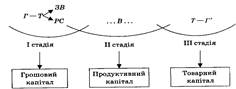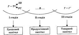Функціонуючи за схемою Г— Г—Г', капітал безперервно повертається до своєї початкової форми, здійснюючи своєрідний рух по колу. Реальний кругооборот промислового капіталу проходить три логічно-послідовні стадії: