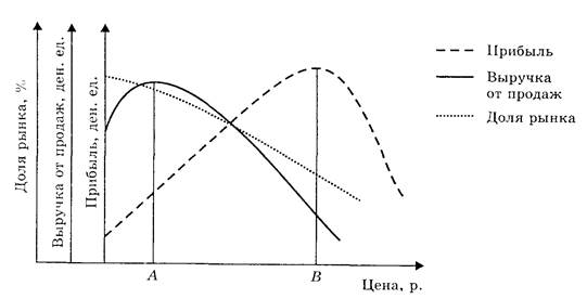 Если предприятие ставит своей целью максимизировать прибыль, то ему следует стремиться установить цену, соответствующую значению точки В. Если же оно предполагает увеличить выручку от продаж, то цена должна равняться своему значению в точке А. В том случае, если предприятие намечает увеличивать долю рынка, то цену следует устанавливать еще ниже, чем в точке А. Диапазоном основного выбора возможной цены с точки зрения оптимального соотношения между ценой, прибылью, выручкой от продаж и долей рынка можно считать интервал между максимальным значением выручки от продаж (точка А) и прибыли (точка В).