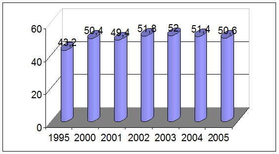 В основных фондах воплощена подавляющая и наиболее важная часть материальных ресурсов общества. Они составляют главную часть национального богатства страны. В таблице 1 представлены данные о наличие основных фондов промышленности России за 1995-2005 гг.