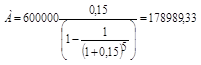 Ипотечный кредит в 600000 руб. выдан на 5 лет под 15 % годовых. Определить размер ежегодного платежа.