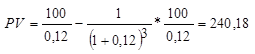 По условию: аннуитет A=100 руб.; период n=3 года; доходность i=12%