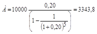Получен кредит в банке на 5 лет в размере 10000 тыс. руб. под 20 % годовых. Определить величину равного срочного платежа погашения.