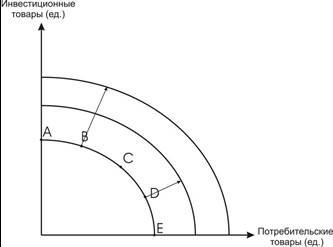Хотя все точки на кривой производственных возможностей означают эффективность, выбор положения на кривой сегодня влияет на темпы экономического роста завтра. Это видно на графике ниже. Из точки B экономический рост будет выше, чем из точки D, так как в точке B сегодня больше производится инвестиционных товаров или товаров для будущего.