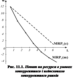 відображає множина співвідношень граничної доходності ресурсу і його кількості. Рис. 11.1 представляє криві попиту на працю досконалого конкурента та монополіста на ринку готової продукції . Кожна точка на кривих попиту фірми на працю