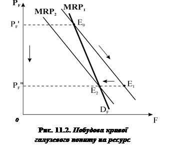 на ресурс не є простою сумою попиту окремих фірм. Крива попиту для кожної конкурентної фірми будується за припущення про незмінність ціни готової продукції. Крива галузевого попиту на ресурс (рис. 11.2) повинна враховувати можливі зміни у попиті всіх фірм, пов’язані зі зміною ціни готової продукції.