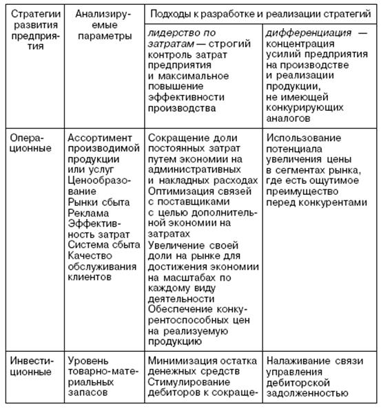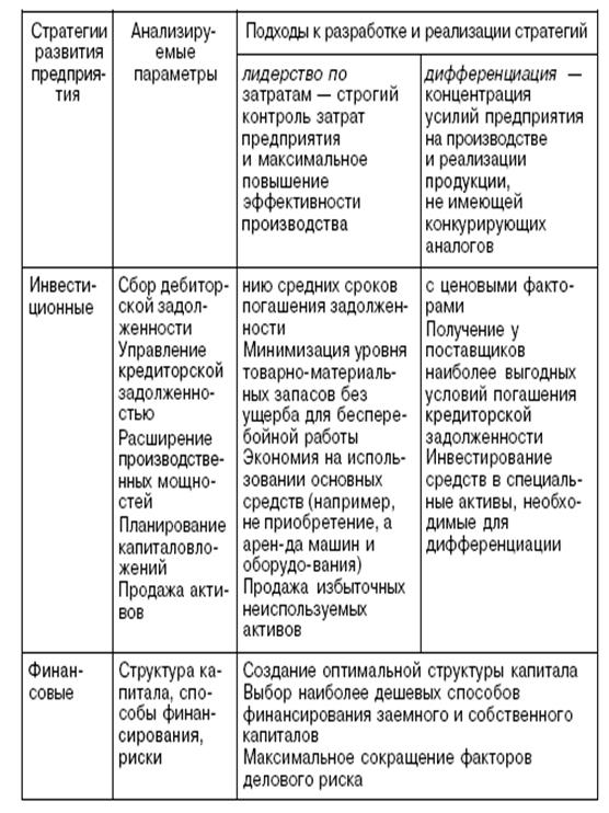 Главная цель реструктуризации — поиск источников развития предприятия (бизнеса) на основе внутренних и внешних факторов. Внутренние факторы основаны на выработке операционной, инвестиционной и финансовой стратегий, а внешние — на реорганизации видов деятельности и структуры предприятия. Стратегии развития предприятия и их воздействие на факторы его стоимости приведены в таблице 1 [6].