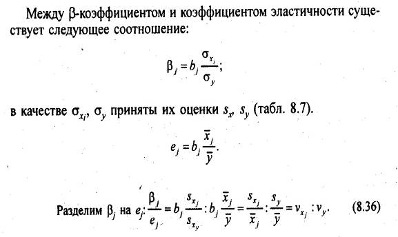 Итак, мы получили, что ?-коэффициент фактора хj относится к коэффициенту эластичности этого фактора, как коэффициент вариации фактора к коэффициенту вариации результативного признака. Поскольку, как видно по последней строке табл. 8.7, коэффициенты вариации всех факторов меньше коэффициента вариации результативного признака; все ?-коэффициенты меньше коэффициентов эластичности.