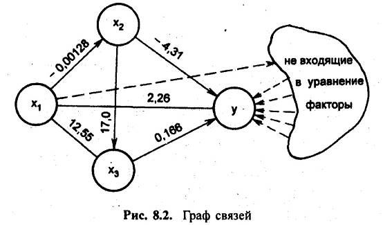 Условно-чистый коэффициент регрессии при x1, составляет только 58% парного. Остальные 42% связаны с тем, что вариации x1 сопутствует вариация факторов x2 x3, которая, в свою очередь, влияет на результативный признака. Связи всех признаков и их коэффициенты парных регрессий представлены на графе связей (рис. 8.2).