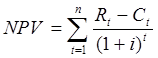 где NPVœ чистая приведенная стоимость; Rt - доход (выгода) от проекта в году t; Ct; - затраты на проект в году t; i - ставка дисконта, n-число лет цикла жизни проекта.