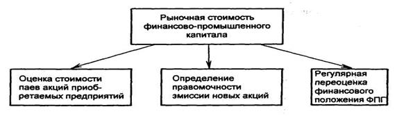 Оценка капитала ФПГ может ориентироваться на капитализацию акций, определяемую как умножение рыночной стоимости акций, находящихся в обращении, на их количество. Рыночная стоимость акций является универсальным критерием, позволяющим отразить реальное положение ФПГ на рынке, учесть в совокупности промышленный и финансовый секторы, выявить убыточные предприятия и в целом дать точную оценку капитала.