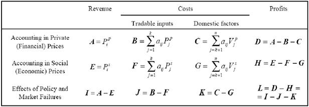 По этим причинам, авторы используют анализ соотношения социальных затрат и выгод (СЗВ) чтобы внести ясность в состояние конкурентоспособности белорусского сельского хозяйства. СЗВ – это только один из многих индикаторов, который рассчитывается, используя как основу Матрицу анализа политики (Policy Analysis Matrix, PAM), разработанную Монке (Monke) и Пирсон (Pearson) (1989). PAM комбинирует два расчетных тождества. Одно определяет прибыльность как разницу между доходом и затратами. Другое рассчитывает эффекты отклонений (искажающая политика и провалы рынка) как разницу между наблюдаемыми частными и социальными ценностями, которая останется, если искажения будут устранены. Структура МАП представлена в таблице 1. В ней также содержаться конкретные определения терминов. Информация о расчетах СЗВ, представленных ниже, приведена в приложении.