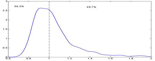 Результаты СЗВ анализа при производстве хлебных злаков и молока в 2007 г. представлены на рис. 1.1 и 1.2 соответственно, а основные выводы приведены в табл. 1.2. Распределения показывают, что при производстве злаков (50.3%) и молока (60.4%), относительно высокая доля хозяйств в Беларуси конкурентоспособна. Конкурентоспособные хозяйства занимают непропорционально высокую долю в общем объеме производства обоих продуктов; табл. 2 показывает, что конкурентные хозяйства производят 63% хлебных зерновых и 73% молока в Беларуси. Следовательно, конкурентные хозяйства имеют тенденцию в среднем производить больше, чем неконкурентоспособные хозяйства. Распределения на рис. 1.1 и 1.2 показывают, что подавляющее большинство конкурентоспособных хозяйств имеют СЗВ 0.8 и выше. Другими словами, их издержки на единицу выпуска составляют 80% и выше от дохода на единицу выпуска. Многие хозяйства работают в пределах, близких к точке безубыточности в терминах социальных затрат-выгод, и небольшие изменения в производительности или ценах может сдвинуть их с одной стороны конкурентоспособного порога (SCB=1) на другую. Распределения также показывают, что многие хозяйства Беларуси далеки от производства конкурентоспособных молока и хлебных злаков. Почти 50% всех хозяйств, которые производят хлебные зерновые в Беларуси, являются неконкурентоспособными; стоимость их выпуска ниже, чем стоимость используемых факторов производства, их производственная деятельность делает Беларусь беднее, а не богаче. Аналогичная доля хозяйств, производящих молоко, ниже 40%.