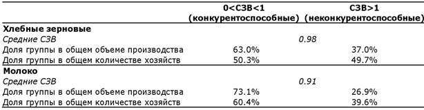 Таблица 1.2. Результаты СЗВ при производстве хлебных злаков и молока, 2007