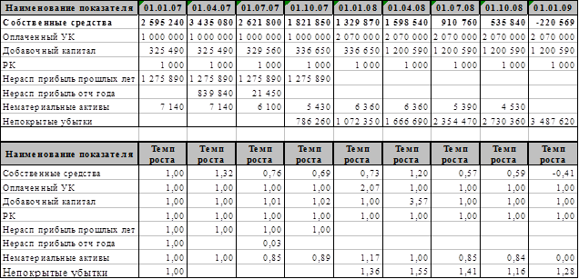 Величина чистых активов компании(табл.№2) в течении 2007 года превышала размер уставного капитала, но в 2008 году наблюдалось обратная ситуация: чистые активы не полностью покрывали уставный капитал.