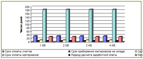 Проанализировав данную диаграмму можно сделать вывод, что в течение отчетного года продолжительность расчетных сроков предприятия не изменялась. Наибольшее значение имеет срок оплаты материалов, он составляет 184 дня. А наименьшее значение имеет срок пребывания материалов на складе и составляет 6 дней.