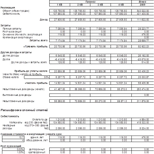Доход рассчитывается как разница между объемом продаж и себестоимостью реализованной продукции. В прогнозируемом периоде себестоимость ниже объема продаж, поэтому предприятие в результате основной своей деятельности имеет прибыль. В 2009 году прибыль составит 111622,00 тыс. грн. По кварталам 2009 года – 27905,50 тыс. грн.