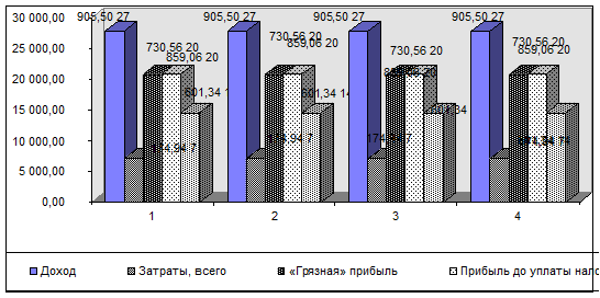 Проанализировав диаграмму, можно заметить, что в течение всего прогнозируемого периода доходы превышают затраты. Предприятие получает в результате всей деятельности прибыль.